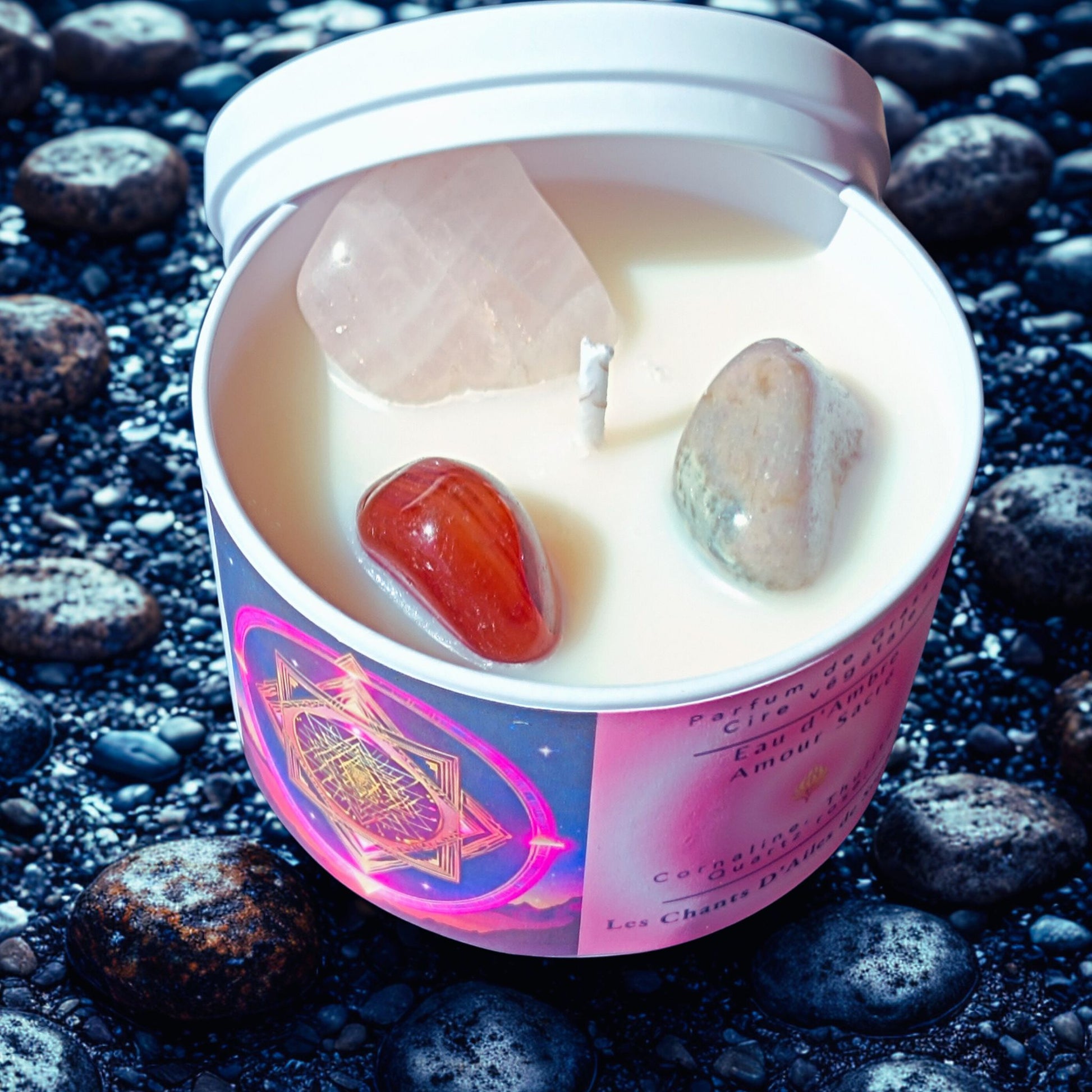 Chaque bougie est coulĂ©e Ă la main, en cire vĂ©gĂ©tale, et infusĂ©e dâĂ©nergies lumineuses pour vibrer lâamour sous toutes ses formes.