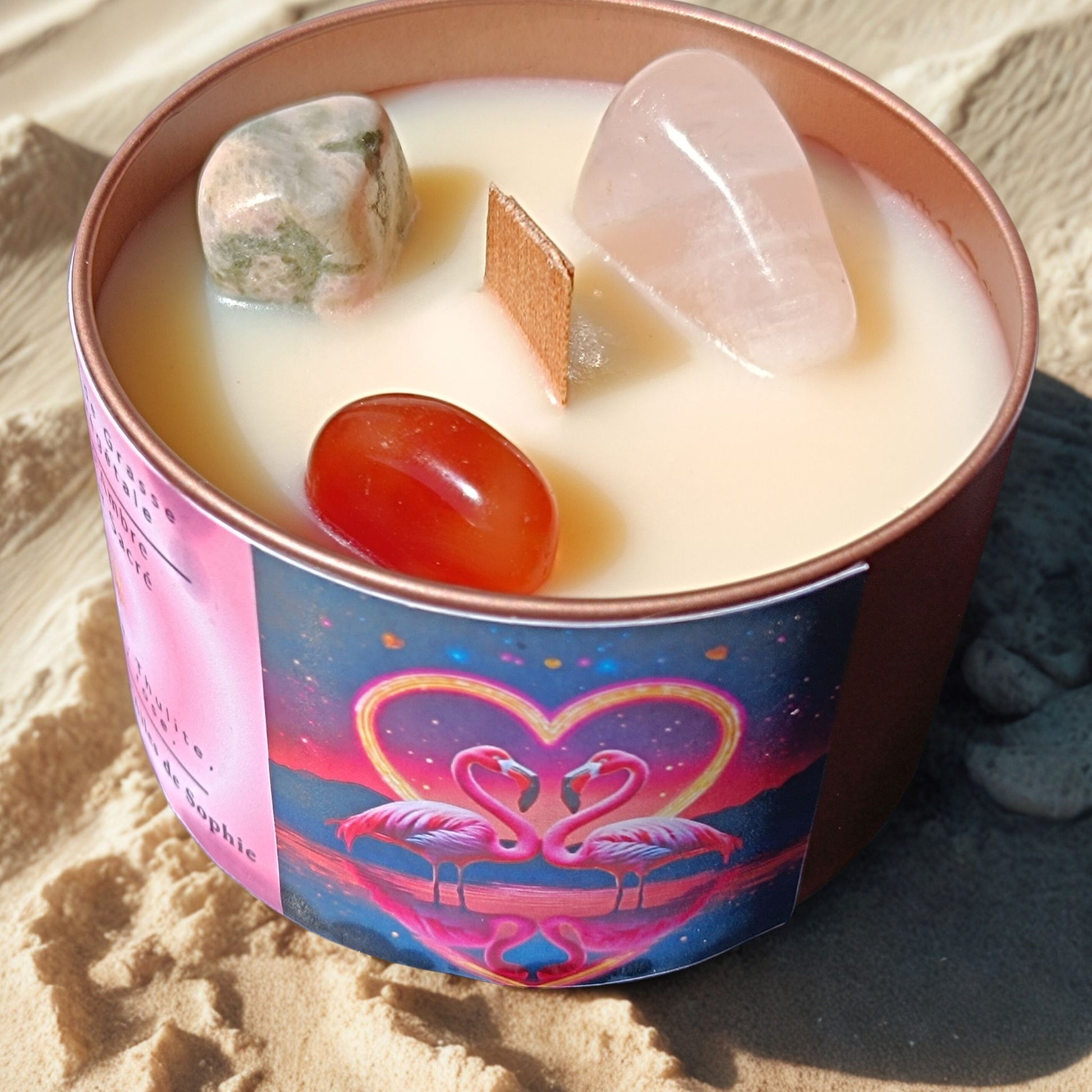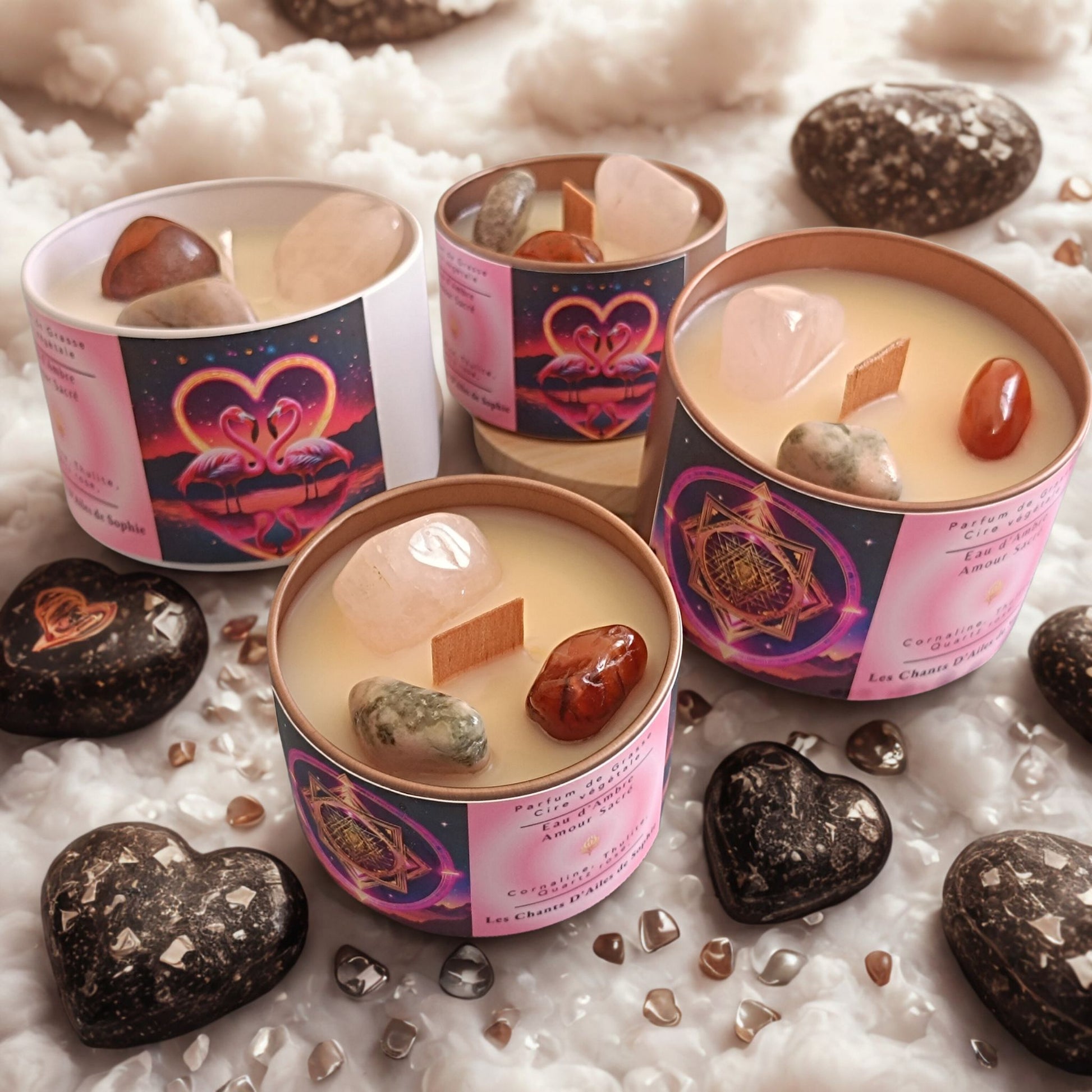 Créations faites main et pierres de lithothérapie : chaque bougie est unique.